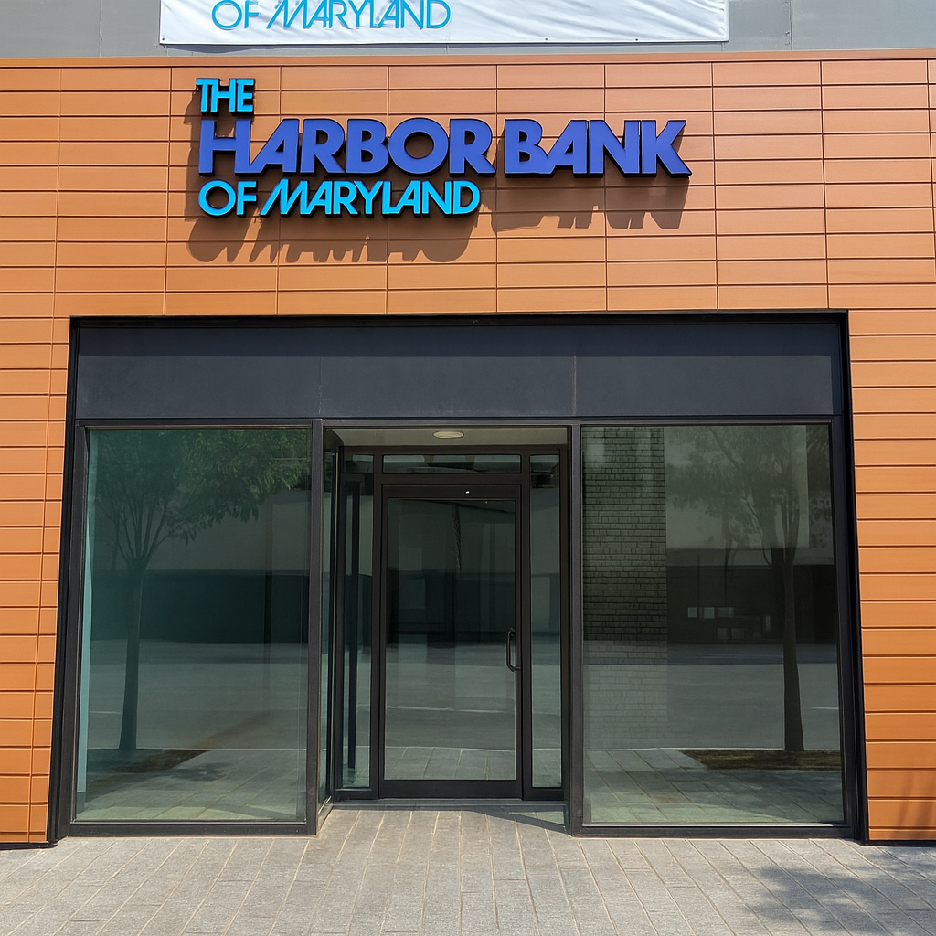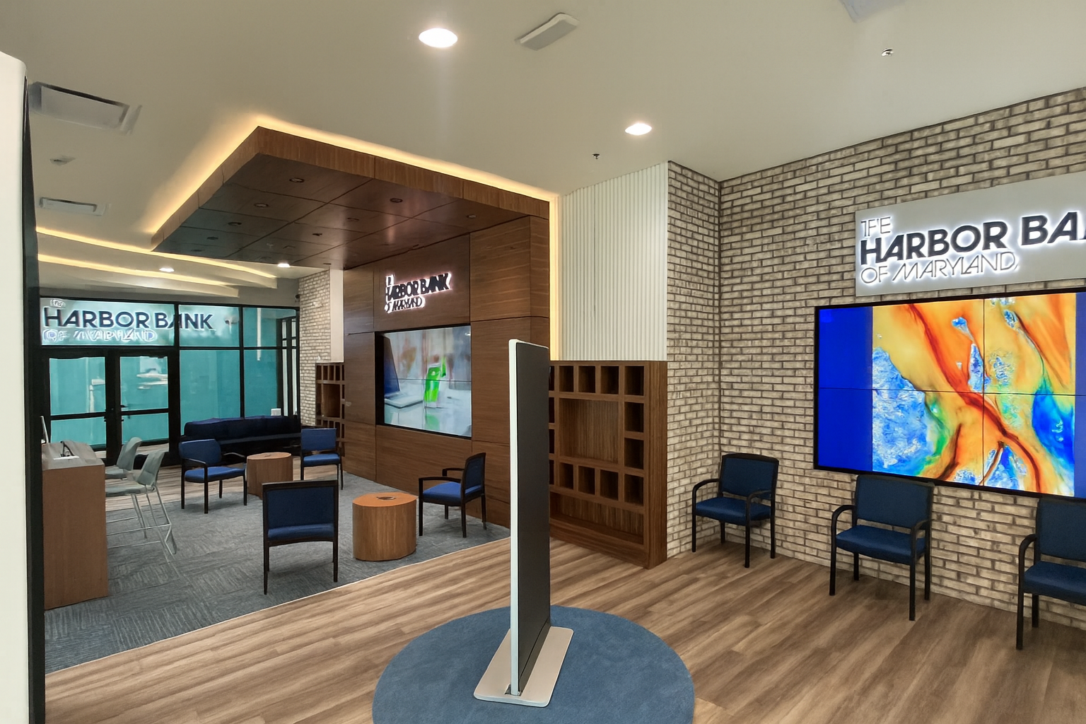 The Baltimore based Harbor bank enters a new market into the Montgomery County Maryland with the opening of its “Starship” branch location with a custom featured millwork wall and canopy anchoring the complete 1,600 sf buildout.