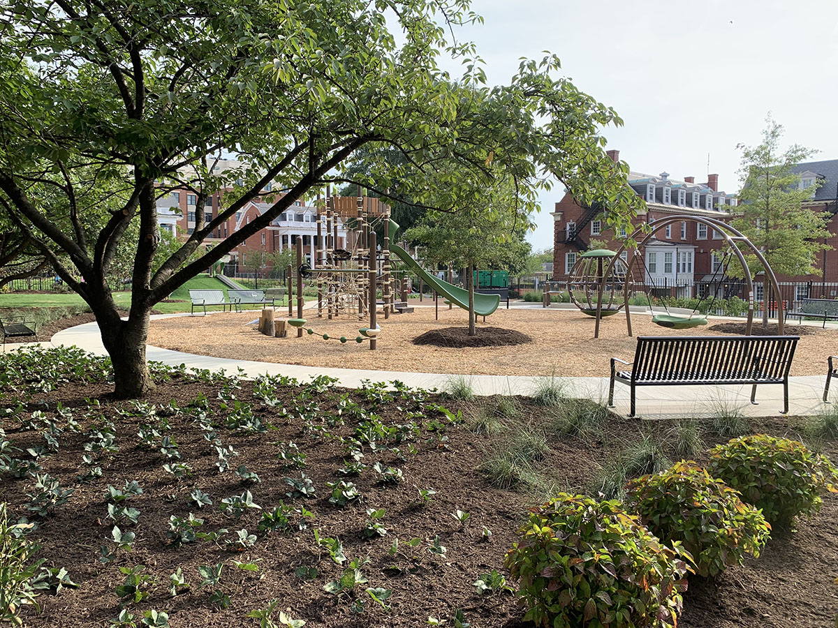 The Historic Parks at Walter Reed Community Playground project included the construction of a new playground area for ages 2-12, located at the Butternut Street entrance to the development. The scope of work included sediment and erosion control, landscaping, and installation of natural material playground equipment, that included sandbox, berm, swings and climbing areas.